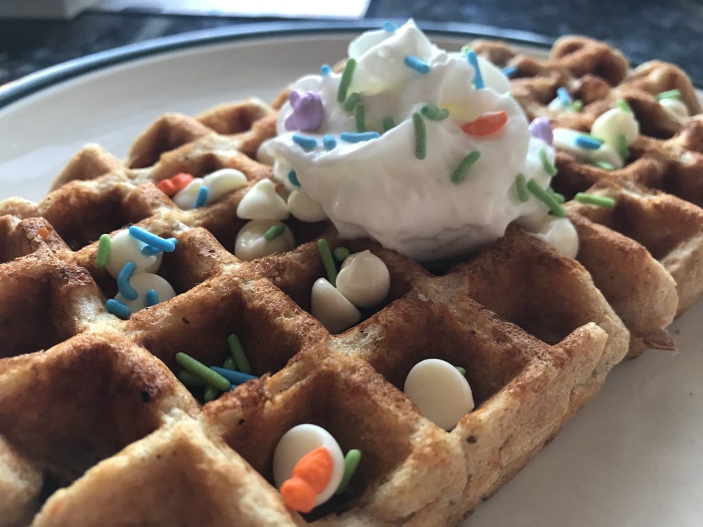 Since I had a lot left over, I started to think of other things I could use the leftovers for – salad came to mind first and then came waffles. I know, weird to jump from salad to waffles, but here we are.